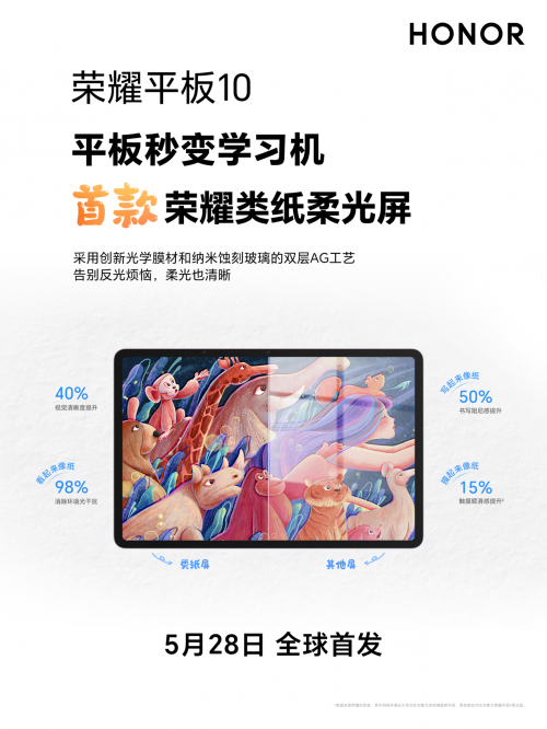 5月26日,荣耀官方发布荣耀平板10 柔光版搭载类纸柔光屏技术,荣耀在屏幕领域再添一项亮眼成绩,柔光率和清晰度大幅领先同期水平。此外,荣耀类纸柔光屏还荣获主流平板中唯一的莱茵类纸显示认证,是目前业内显示效果最高清、最接近纸张的护眼柔光屏。