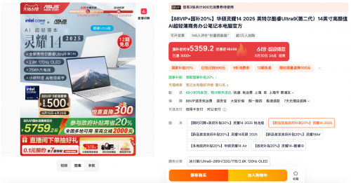 华硕灵耀14 2025,88VIP国补消费券后到手仅5759.2元