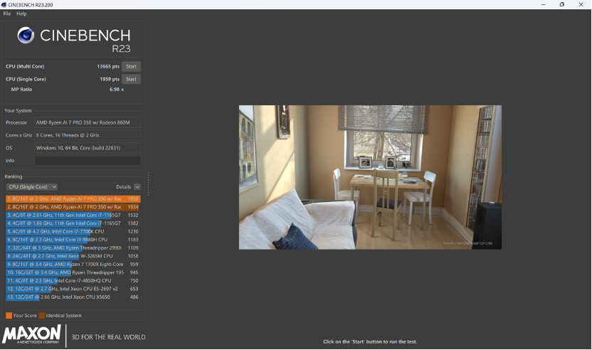 在处理器测试中,Cinebench R23 实测多核成绩 13665 pts,单核成绩 1959 pts;Cinebench 2024 中多核成绩 768 pts,单核成绩 115 pts,体现出其在多核计算与单线程响应上的均衡表现。