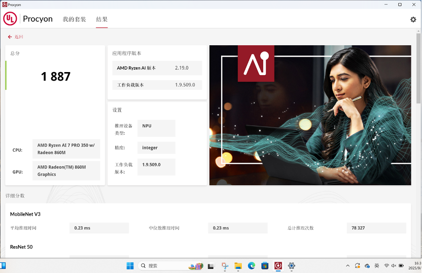 Procyon 针对 AMD NPU 的专项 AI 测试中,该机获得1881分的成绩,进一步验证了其在 AI 计算性能上的领先地位。这意味着在多任务办公或高频AI调用场景下,T14 Gen 6都能保持系统流畅、响应迅速。