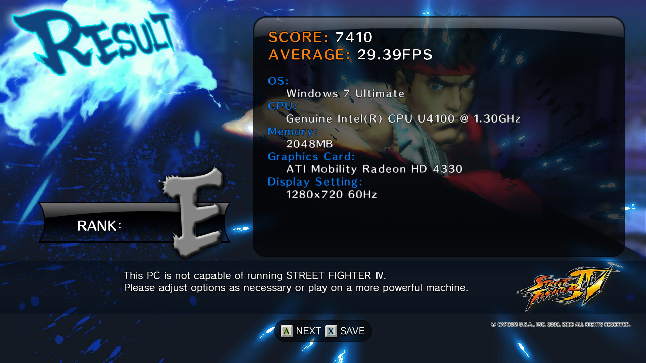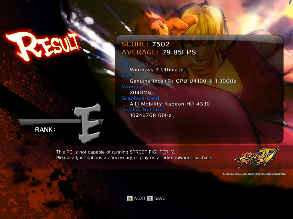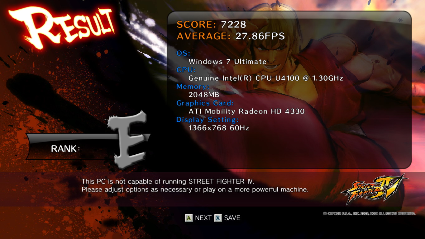 我们选择了两款主流的PC游戏对这款产品实际应用的性能进行了测试,测试游戏包括了《街头霸王IV》、《生化危机5》,我们均采用了Capcom官方发布的测试程序来进行检测。在测试中,我们安装了英文版Microsoft Windows 7 Ultimate Version 6.1.7600版本的操作系统进行测试。