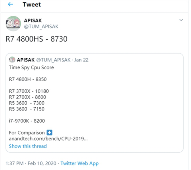 Ryzen 7 4800HS与Ryzen 7 4800H一样都是8核心16线程的处理器,具备16MB L3缓存,主频2.9GHz,最大睿频4.2GHz。根据推特爆料大神@TUM_APISAK的爆料,Ryzen 7 4800HS在3DMark Time Spy测试中取得了CPU单项得分8730分。而桌面级二代锐龙中的高端产品Ryzen 7 2700X才仅有8600分,竞争对手英特尔的最新九代酷睿i7-9700K在同项目中的得分在8200分,虽然i7-9700K的得分较低可能是由于缺少了超线程,但单从分数来看,Ryzen 7 4800HS的性能已经超越了这两颗TDP为95W的桌面级高端处理器,性能相当强大。