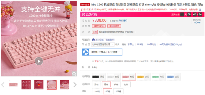 目前这款87键的C200机械键盘售价为338元,支持满减299元减30元,到手价格完全接受的起,而且多种颜色,可以根据女友的喜爱进行选择。【戳这里前往京东查看】