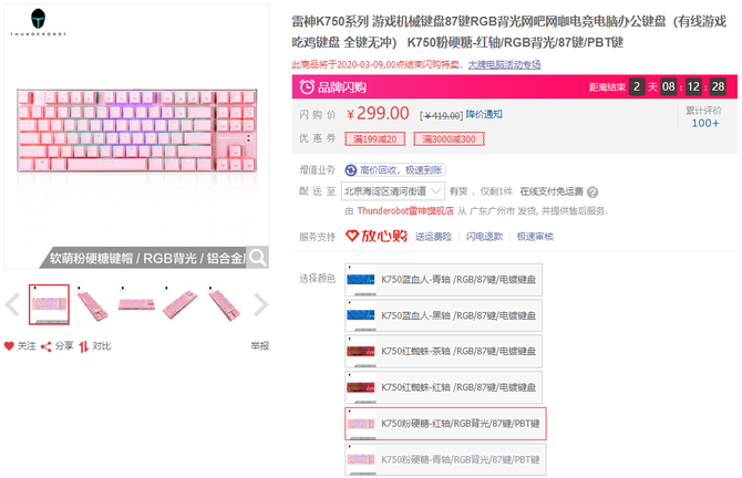 雷神主要也是以电竞主机、游戏本为主,得益于这两年粉丝的大量增长,在电竞周边设备方面也逐渐形成自己的矩阵和风格,其超高的性价比受到用户的喜爱。这款键盘在女神节期间的售价为299元,已经是一个相当有诚意的价格了,粉色的机械键盘值得入手。【点击这里直达京东购买】