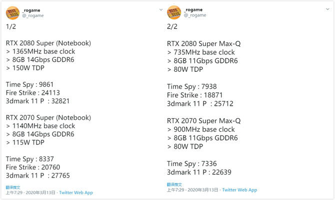 而今日,推特爆料者@_rogame曝光了包括RTX 2080 Super、RTX 2070 Super和RTX 2060 6GB的详细规格和性能跑分。其中RTX 2080 Super和RTX 2070 Super都提供标准版和Max-Q设计两版,都将采用与桌面级独显相同的TU104核心,RTX 2080 Super具备3072个CUDA核心,RTX 2070 Super具备2560个CUDA核心,Max-Q设计的核心频率和显存频率都比标准版要低;而RTX 2060 6GB则采用TU106核心,具备1920个CUDA核心。