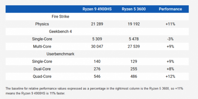 此前Ryzen 9 4900HS的跑分已经多次曝光了,而从结果来看,在3DMark Fire Strike、GeekBench 和Userbenchmark等基准测试中,Ryzen 9 4900HS的各项跑分都要高桌面级Ryzen 5 3600约10%左右,仅在单核性能上略逊一筹。