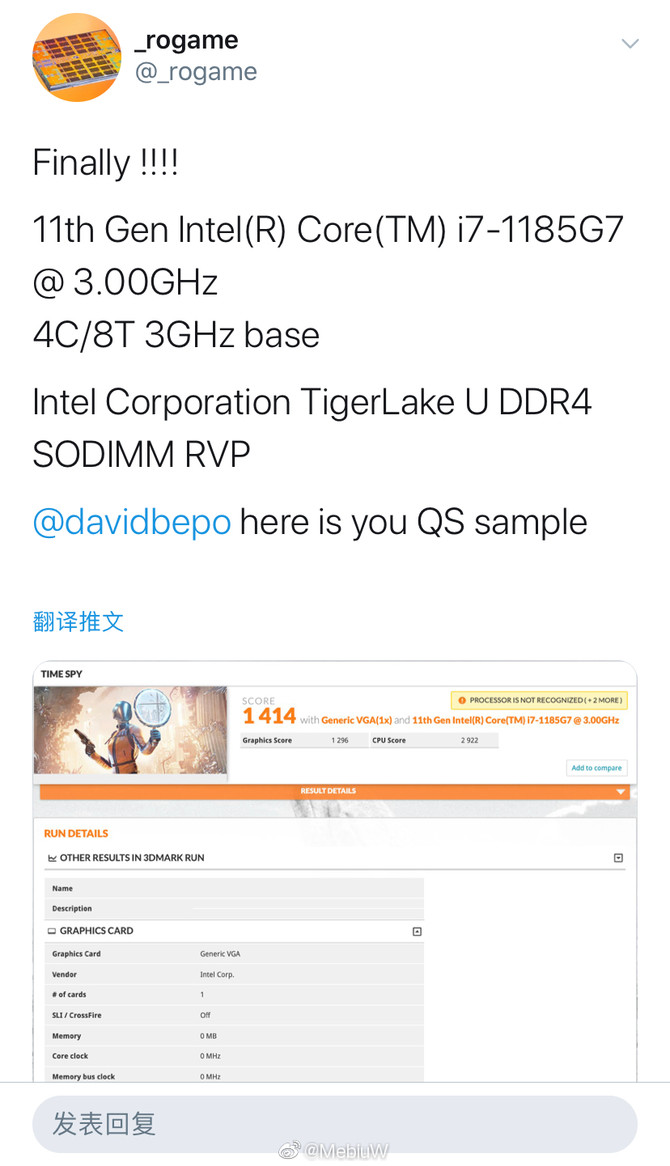 近日,知名爆料博主rogame在3DMark数据库中发现了一颗全新处理器的跑分,识别为“11th Gen Intel i7-1185G7”,根据命名规则,这明显是i7-1065G7的接替者,也就是代号为Tiger Lake-U的第十一代移动酷睿。