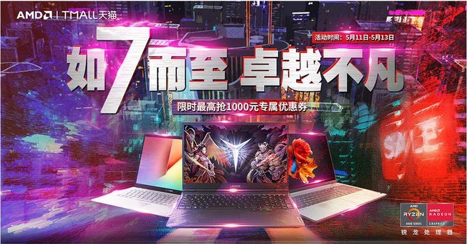 5月13日,AMD携手天猫电脑潮品大牌日 “如7而至,卓越不凡” 开启。优惠活动覆盖了多款热门锐龙笔记本,便携低压轻薄本到高端标压游戏本一应俱全,降价幅度高逾千元。现在市场上的锐龙笔记本,三代锐龙移动处理器风生水起,低压处理器和对手平分秋色,而四代强势登场也掀起更大的波澜,标压处理器性能甚至更高一筹,不管是追求强劲性能还是优异性价比,总有一款锐龙本适合你。