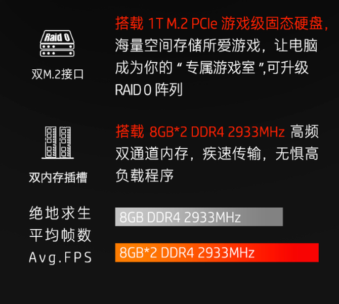 第十代标压酷睿处理器Comet Lake-H默认支持DDR4 2933MHz高频率内存,暗影精灵6的大部分配置采用了双通道设计(部分配置可进一步升级至32GB DDR4),凭借着更大内存带宽和吞吐量,让游戏运行更加顺畅,多任务处理也能游刃有余。此外暗影精灵6还可选500GB/1TB容量的M.2 PCIe SSD,玩家可以随心存储海量的应用数据及3A游戏,打造自己专属的游戏天地。