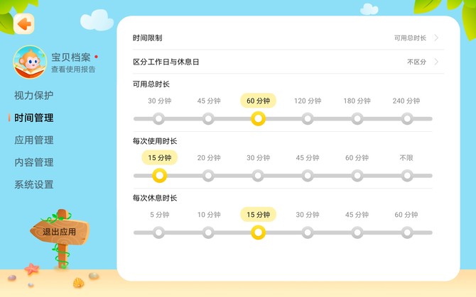 家长可以控制儿童模式的使用时间,防止沉迷,不仅可以控制时间,还可以控制应用和内容。家长可以设定每次使用的时长,每天使用时长,防止小朋友沉迷使用。