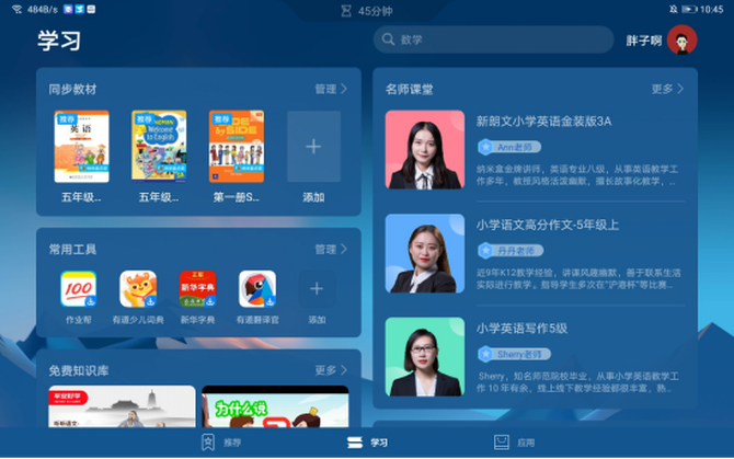 在荣耀平板V6内的教育中心和儿童乐园两大App中,前者基本覆盖了K12教育的所有教材,内置海量免费、收费的在线课程、名师课堂等等。儿童乐园则是荣耀专为儿童打造的益智教育学习乐园,这里不仅有海量知识可以学习,还有很多好玩的益智游戏,用寓教于乐的方式增长儿童们的知识储备。