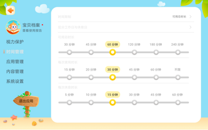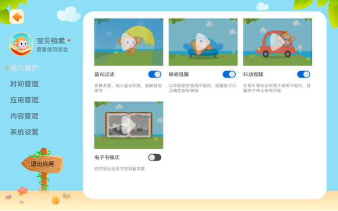 此外家长还可以设置时间管理,设置单次使用的时间和总时长。再比如还可以对应用设置权限,锁定应用市场,设置家长辅助密码,无法随意退回到桌面,让设备更纯粹和彻底的成为孩子们的学习工具。同时,针对视力保护问题,荣耀平板X6还支持蓝光过滤、距离提醒、躺姿提醒、抖动提醒、电子书模式、感光提醒等等功能。