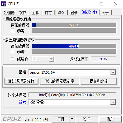 酷睿i7-10875H的功耗为45W,采用了14nm工艺制程,三级缓存高达16MB,另外酷睿i7-10875H单核频率高睿频达到5.1GHz。核心数和主频的提高对于多任务处理能力有极大的提升,通过CPU-Z基准测试可以看到,酷睿i7-10875H的单核得分为533.2分,多核得分为4991.6分。