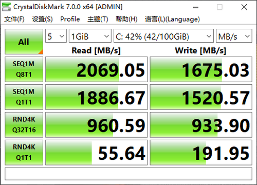 硬盘的顺序读取速度为2069MB/s,写入速度1675MB/s,可以满足高速数据传输,但是对于游戏本而言,容量相对小了一些,所以后期我们可以自行进行扩展。