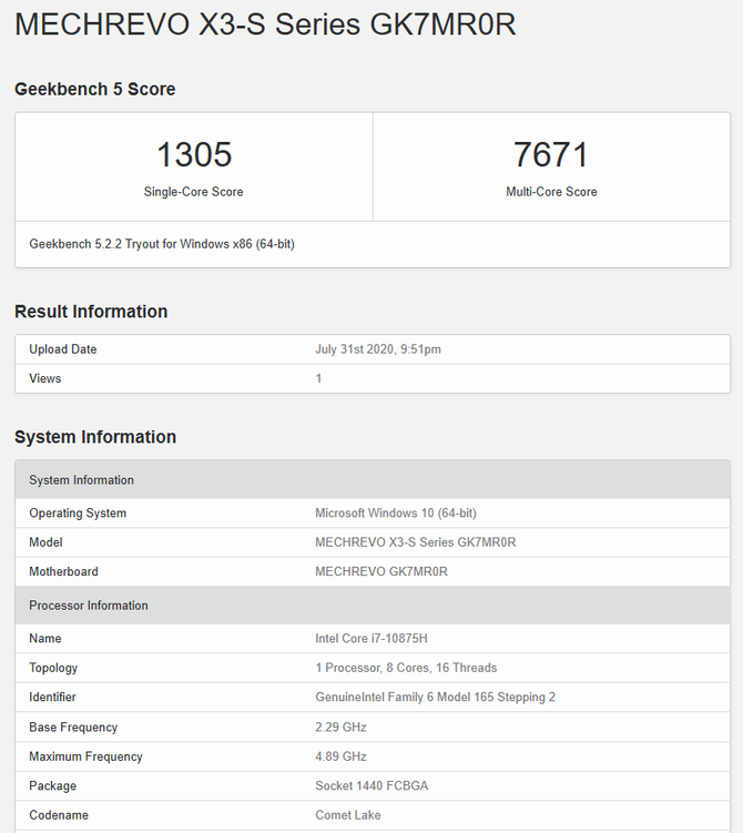 Geekbench 5.5.2版也是更加专注于对CPU的测试,也是CPU基准测试跑分的必备软件,最终的成绩单核1305,多核得分7671,表现足够优异。