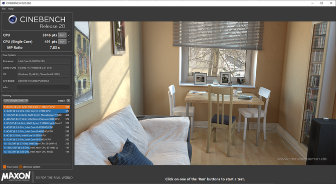 在Cinebench R20中可以看到CPU的多核成绩高达3846pts,单核成绩达到491pts,Cinema 4D和Cinebench都是MAXON公司研发,其中Cinema 4D被广泛运用在3D建模、贴图、配装、动画等等环境中,所以Cinebench的得分对于有专业需求的用户来说能够更加准确的反馈i7-10875H这颗CPU对工作的实际运用情况。