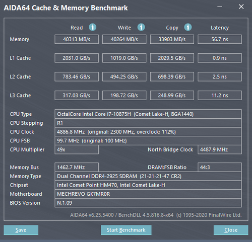AIDA64内存测试中,读取速度达到40313MB/s,写入速度40264MB/s,时延56.7ns,属于较高端水平。