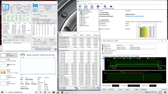 从得分上可能很难直观的感受到酷睿i7-10875H带来的提升,多核+高主频的设计理论上能为多任务处理能力提供更多的帮助,例如游戏主播通常需要在后台运行多种程序,除了占大多数资源的游戏外,直播软件、弹幕软件或者说视频优化软件都会在后台占用硬件资源。通过aida64对CPU单独进行烤机(室温25℃)的过程中发现,在持续拷机15分钟后频率稳定无下降,当然这和机械革命深海泰坦X3-S的优秀散热设计是不无关系的。