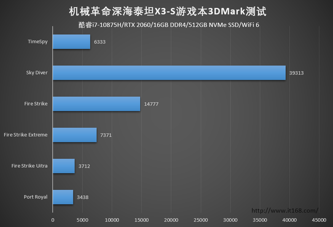 对于游戏本上来说,显卡也是占据一大半的重要性。机械革命深海泰坦X3-S上的这块RTX2060通过3DMaker中的测试,Time Spy得分6333,Fire Strike得分14777,Fire Strike Extreme得分7371,Fire Strike Uitra得分3712,由于这款显卡还支持光追,所以可以运行Port Royal,最终的得分3438。从得分成绩来看,这块RTX2060在游戏本中的表现十分优异,通过实际的游戏测试结果也是如此。