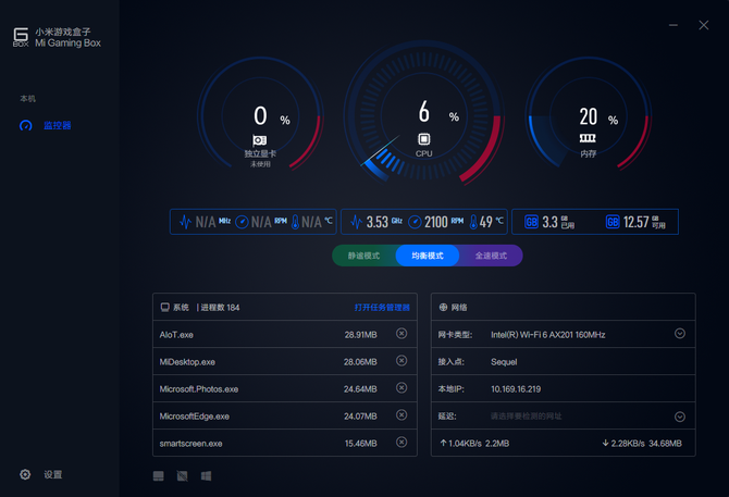 另外我们还可以打开“小米游戏盒子”手动进行模式切换,同时在游戏盒子内我们可以看到整机的运行状态和各种数据,方便我们更好的了解整机的状态。