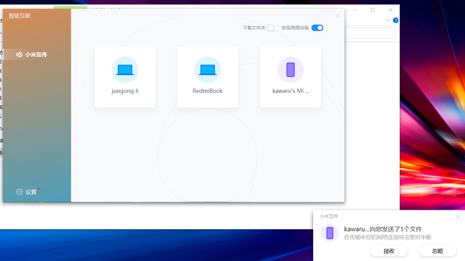 不光如此这款笔记本同样搭载了小米互传,可以在通过手机将图片、文件等快速传输到笔记本电脑里面,日常使用非常方便。