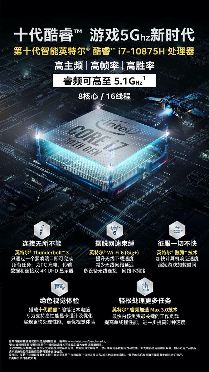 英特尔在去年首先为移动端的轻薄本产品带来了十代酷睿处理器的加持,对比上一代产品,性能有了很大的增幅,让人更加期待用于游戏本的标压十代酷睿会有怎样的性能表现。上半年英特尔终于发布了十代酷睿H系列处理器,其中酷睿™i7-10875H处理器无疑是个特殊的存在,它是移动端酷睿i7处理器中先进拥有8核心16线程的产品,对比6核心12线程的i7-10850H和i7-10750H,不仅拥有更强的多线程性能,而且其拥有5.1GHz的最大单核睿频加持,是目前移动端少有的睿频达到5GHz的处理器,能够为游戏以及专业高性能工作提供强大的性能支撑。