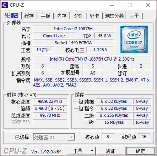 先用一张图来看看这颗酷睿i7-10875H处理器的总体特性: