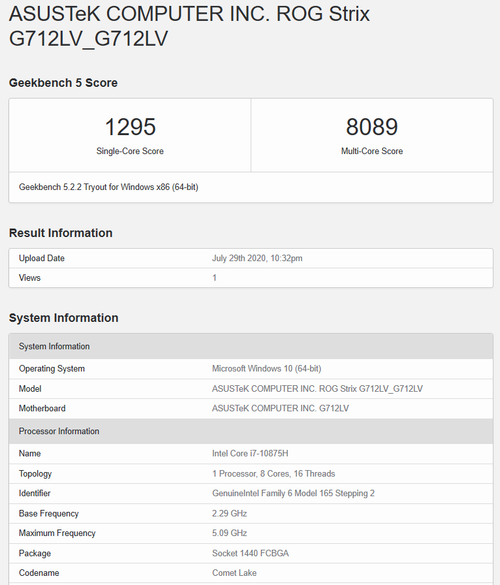 在Geekbench 5的性能测试中,这台ROG魔霸4游戏本的CPU性能依旧表现抢眼,单核分数1295分,多核分数8089分。