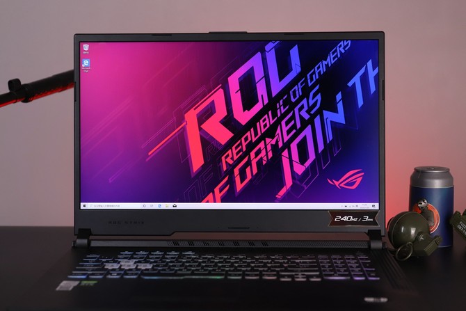 B面的屏幕采用了一块15.6英寸IPS屏,屏幕右下角的贴纸彰显了这块屏幕的电竞素质——拥有240Hz的超高刷新率和短至3ms的快速响应。240Hz的高刷新率对比传统60Hz有着大受好评的优势,尤其是在电竞游戏当中,顺滑的画面效果和更少的画面撕裂能够让玩家的胜利更加轻松。还有一点值得好评,ROG在这款魔霸4游戏本上取消了当下已经沦为鸡肋的网络摄像头,使得屏幕边框进一步缩窄至6mm,屏占比达到81.5%。
