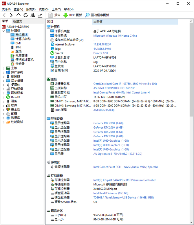 游戏本除了优秀的处理器性能外,其它硬件的素质同样决定了实际游戏效果的好坏。我们手上这款ROG魔霸4除了拥有性能强劲的英特尔十代酷睿i7-10875H处理器。还拥有2×8双通道DDR4 3200MHz内存、2块512GB 的M.2 SSD组成RAID 0(共有3个M.2插槽,其中两个支持组RAID 0)和NVIDIA RTX 2060独立显卡。