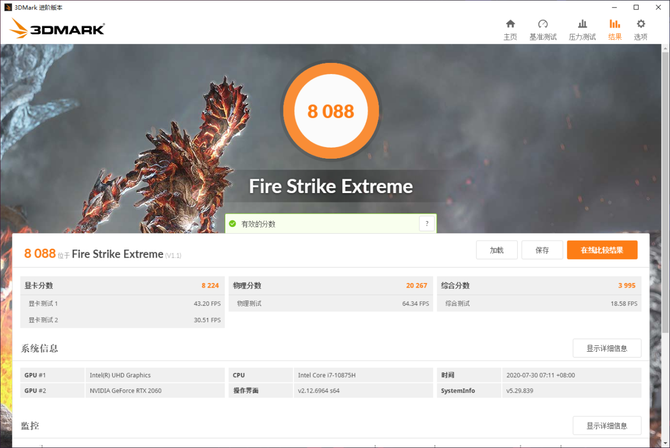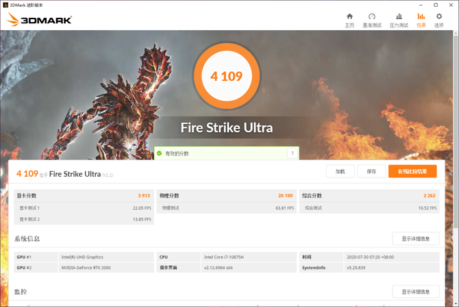 在3DMark Fire Strike基准测试中,ROG魔霸4的RTX 2060显卡跑出了17572分的成绩,在Fire Strike Extreme和Fire Strike Ultra两项压力更高的测试中,ROG魔霸4也能够完整运行,足见其能够满足1080P分辨率下绝大多数游戏的运行需求。