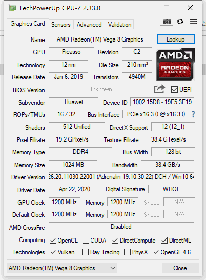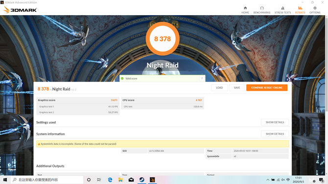3D方面我们使用3Dmark进行测试,Night Raid的成绩是8378分,性能足够应付一些网络游戏,同时对于一般3D应用,AMD RadeonVega8核心显卡也完全能够轻松胜任。