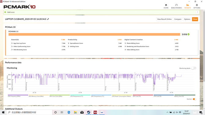 综合性能方面使用PCMark10进行测试,PCMark通过模拟用户日常使用的情况来全面评估电脑的性能,并且最终给出一个参考分数,分数越高则代表整机的性能也就越强,在这项测试中,荣耀MagicBook 14 SE的最终得分为3818,性能表现强劲。