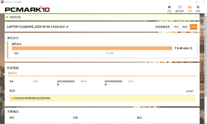续航方面,同样使用PCMark进行测试,设置在高性能模式,在现代办公的续航测试中,荣耀MagicBook 14 SE电量从100%消耗到关机需要7小时40分,56Wh大容量电池为荣耀MagicBook 14 SE提供非常出色的续航表现,可以满足一天不插电学习、办公需求。