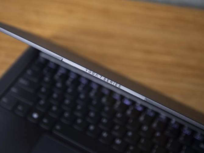 机身上半部分的顶部还有联想“YOGA 7 Series”的标识,同时边框设计了磁铁,在我们将显示器合上的时候,能够和机身自动紧密吸合在一起。