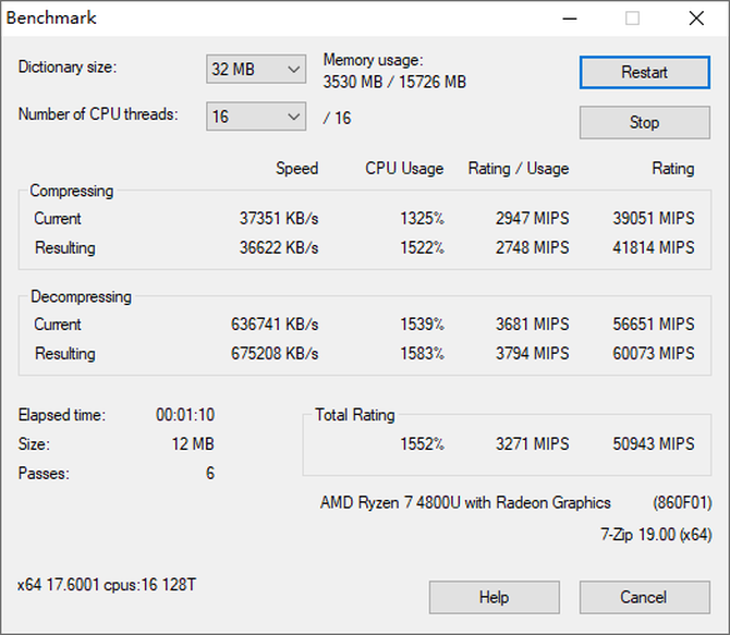 解压缩是我们日常比较常用的功能,同时解压缩性能对于处理器的要求同样较高,我们使用7-ZIP进行基准测试,最终AMD锐龙7 4800U处理器的得分为50943MIPS,大幅领先Intel酷睿i7-10710U的41003MIPS,性能表现优秀。