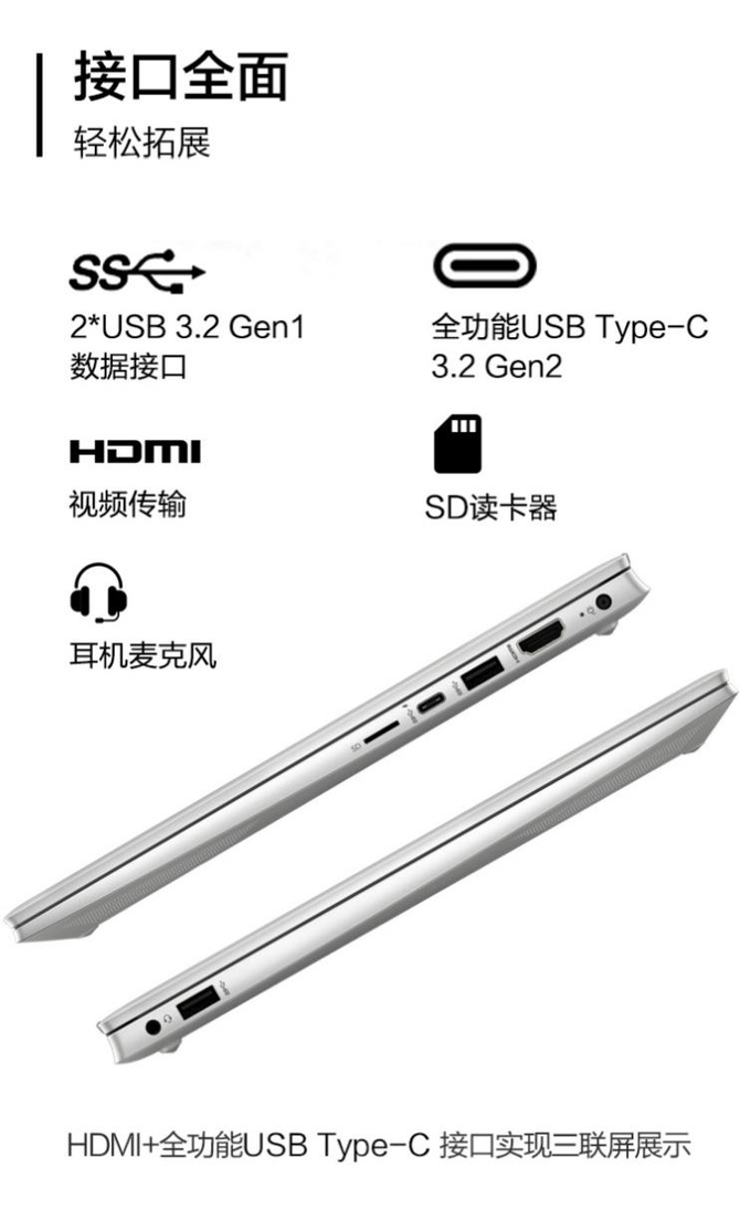 在连接性方面,星14全能轻薄本支持较新的WiFi 6无线网卡并集成蓝牙5.0,上网更为稳定、高速,不容易出现延迟、拥堵的情况,蓝牙设备的连接也会更迅速。惠普还将WIFI接收天线贴心地设计在了A面顶部,不仅使信号接收更顺畅,还可以有效避免天线可能对人体产生的辐射,果然细节决定品质。同时机身侧面还提供了1个HDMI2.0、2个USB 3.2 Gen1、1个全功能USB Type-C 3.2 Gen2、1个SD读卡器卡槽、1个电源接口和1个3.5mm耳麦合一接口,其中全功能USB Type-C 3.2 Gen2接口适合充电、数据传输、多屏展示等多种应用场景。大满贯接口的特性具有完善的拓展连接功能,能充分满足年轻人平时的办公所需,资料传输、客户提案等都能彻底摆脱小尾巴的尴尬。