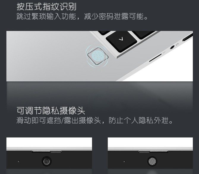 对于一款定位商务的轻薄笔记本来说,安全性是必须要考虑的。首先就是防偷窥的设计,战66四代采用按压式指纹识别及物理防窥摄像头的双重安全方案,按压式指纹识别可以有效的防止居心叵测的人偷窥键盘输入密码,增强了数据的安全性;而物理防窥摄像头则是能够通过滑动拨片来遮挡摄像头,从根源上杜绝了个人隐私的泄露。