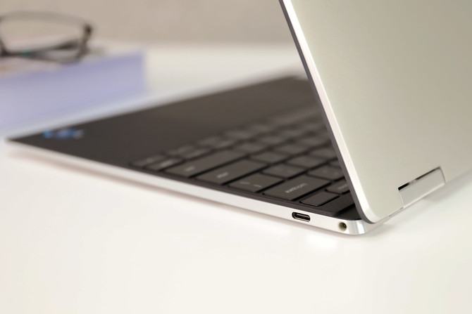 接口部分,这款戴尔XPS13 9310 2in1笔记本在左右侧各配置了一个USB-C接口并提供了一个3.5mm耳机麦克风接口和一个TF读卡器。并且,这两个USB-C接口均为Thunderbolt雷电四标准接口,传输带宽可达40Gbps。为了满足用户外接USB设备的需要,戴尔也为这款笔记本配置了一个USB Type-C转Type-A转接线。