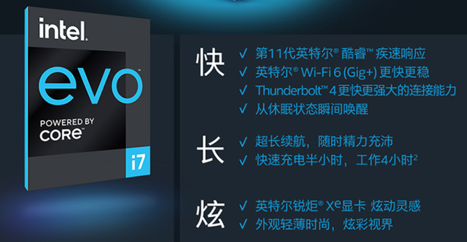 英特尔Evo平台是基于雅典娜计划的较新笔记本创新计划。通过英特尔Evo平台严苛认证的笔记本电脑,除了拥有更强的性能、便携性、续雅典娜计划认证的续航能力,更好的外观设计之外,还必须具备六大关键创新领域的优化,专为需要高端笔记本电脑的客户而设计,采用第11代智能英特尔酷睿处理器搭载英特尔锐炬Xe 显卡,帮助他们保持专注和效率、快速完成重要任务。要买就买11代,芯怀猛虎,炸裂性能!AI加速快5倍!
