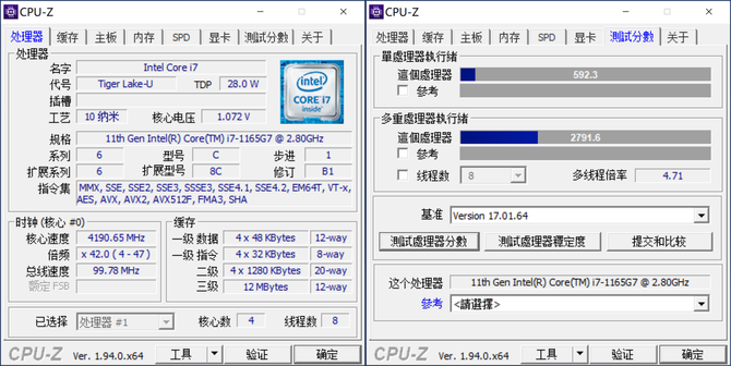 在CPU-Z自带的基准测试当中,这颗酷睿i7-1165G7处理器的单核得分为592.3分,多核得分2791.6分。