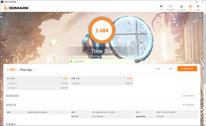 从3DMark Time Spy的测试成绩中我们也可以看出,GPU得分在1515分,对比十代酷睿i7-1065G7的Iris Plus G7锐炬显卡的得分几乎有了翻倍的提升。