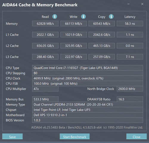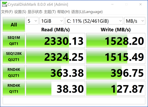 这款戴尔XPS13 9310 2in1笔记本还选用了16GB LPDDR4x双通道内存,内存频率4267MHz,时序20-20-20-64,在AIDA64的性能测试中也有不错的成绩。存储方面,我这台戴尔XPS13 9310 2in1笔记本选用了一块512GB PCI-e固态硬盘。采用CrystalDiskMark 8.0.0软件对其进行测试,顺序读写速度分别达到2330MB/s和1528MB/s。