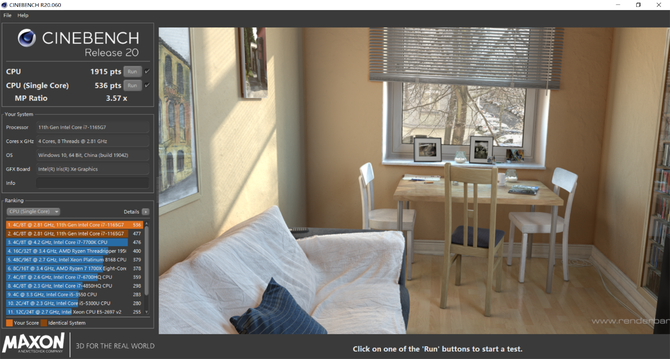 在CINEBENCH R20的测试中,11代酷睿i7-1165G7处理器在灵耀14s上的多核得分为1915pts,单核得分为536pts,无论是多核还是单核得分都超过了同样是4核心8线程的英特尔酷睿i7-7700K处理器,这样的性能表现,可轻松应对日常办公、图形图像处理器和视频剪辑等软件应用的流畅运行。