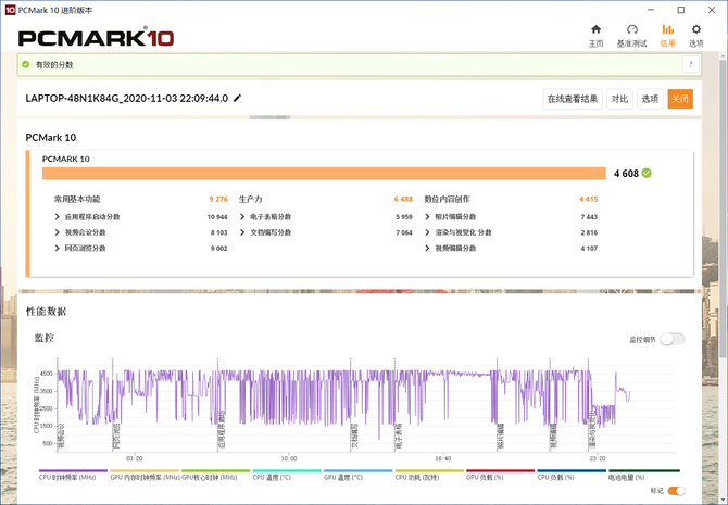 PCMark 10是比较常用的整机性能测试软件,我们主要运行了其在常用基本功能、生产力、数位内容创作下的场景应用成绩,最终的综合得分为4608,结果令人满意。