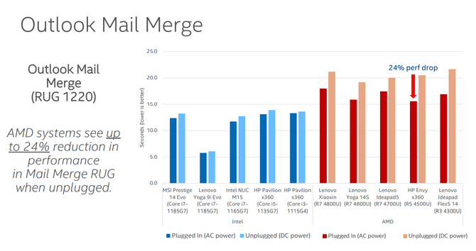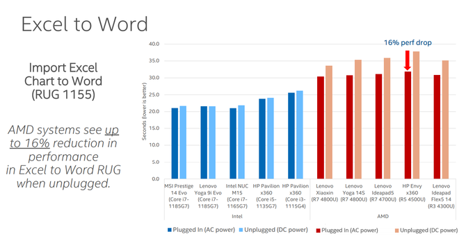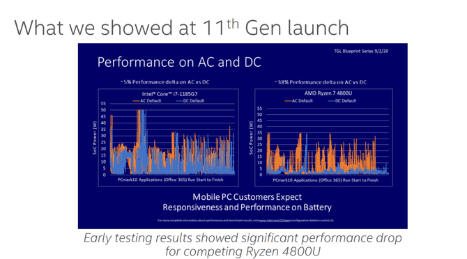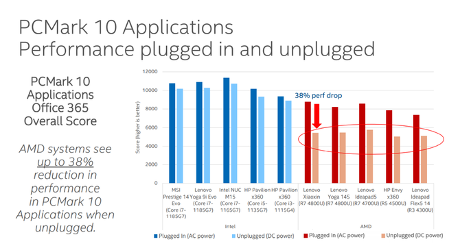 实际上在十一代酷睿处理器发布会上,英特尔就放出了一张PPT,以Core i7-1185G7和Ryzen 7 4800U两款产品进行对比,在PCmark10 Applications的Benchmark下,以微软Office 365为例,英特尔的平台上直流供电和交流供电情况下,性能差别大约是5%,而AMD的Ryzen 7 4800U在交流供电和直流供电下的性能区别差异很大,性能降低近38%,也就是说从交流供电到直流供电性能降低非常明显。