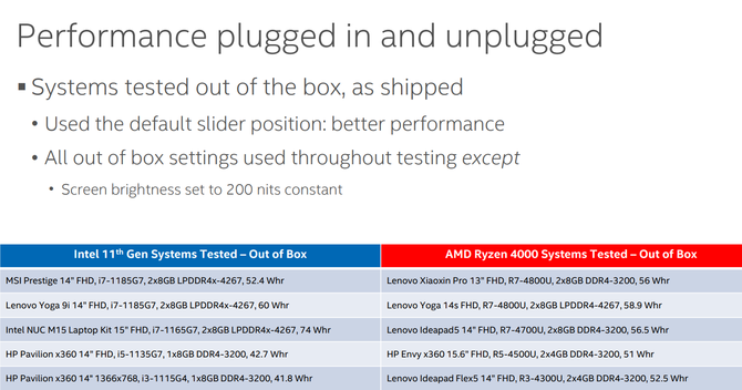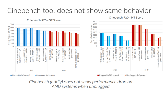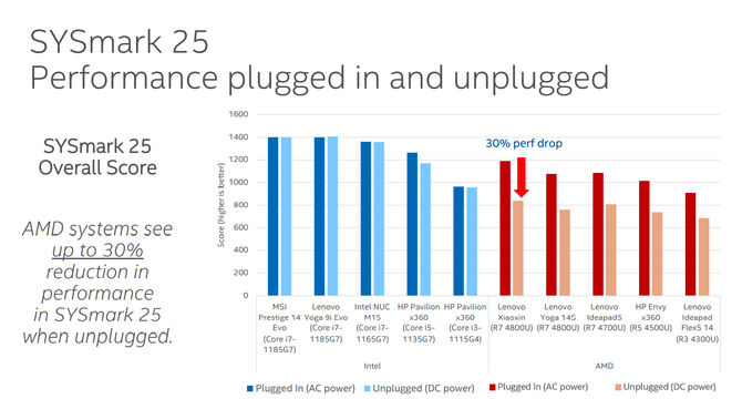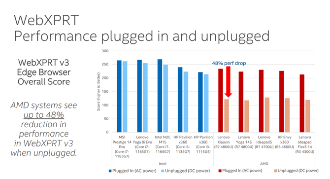 于是,英特尔在日前举办了一次Workshop媒体分享会,并用很大篇幅的PPT文档来验证自己的十一代酷睿处理器与锐龙4000U处理器,在移动办公状态下的使用性能,尤其是在插电和不插电两种情况下的性能差别,最终揭开锐龙4000U处理器的真实面目:原来在移动办公时,你是用降低性能来延长续航时间的!