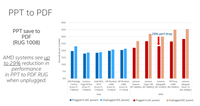 首先是从PPT转成PDF的性能表现。英特尔的性能高大概有20%左右的降低,而AMD从交流供电到直流供电有29%的性能降低。