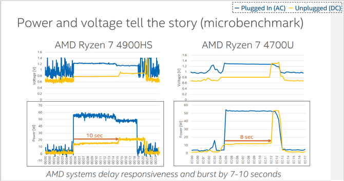 根据英特尔的说法,当Ryzen 7 4900HS和Ryzen 7 4700U都由电池供电时,性能响应延迟会增加,虽然一个简单任务都有10秒延迟,但是用户能够明显感受到。从而得出结论,AMD处理器是通过每个核的供电电压的调制,通过限制电压来限制频率和功耗,牺牲性能来换取电池续航时间的提升。