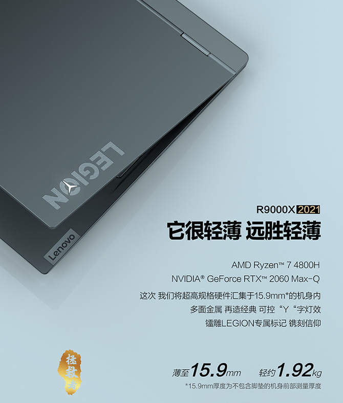 拯救者R9000X系列产品在延续上代轻薄设计的基础上,在性能、显示、散热等方面再次实现突破,重新定义轻薄电竞本。新一代拯救者R9000X 2021整体机身重量轻至1.86kg,薄至15.9mm,精致有型,携带便捷。硬件方面则搭载了AMD R7-4800H标压处理器,强大“内芯”带来更加充足的性能支持,保证了多任务处理、软件应用、大型游戏运行等方面的流畅体验。